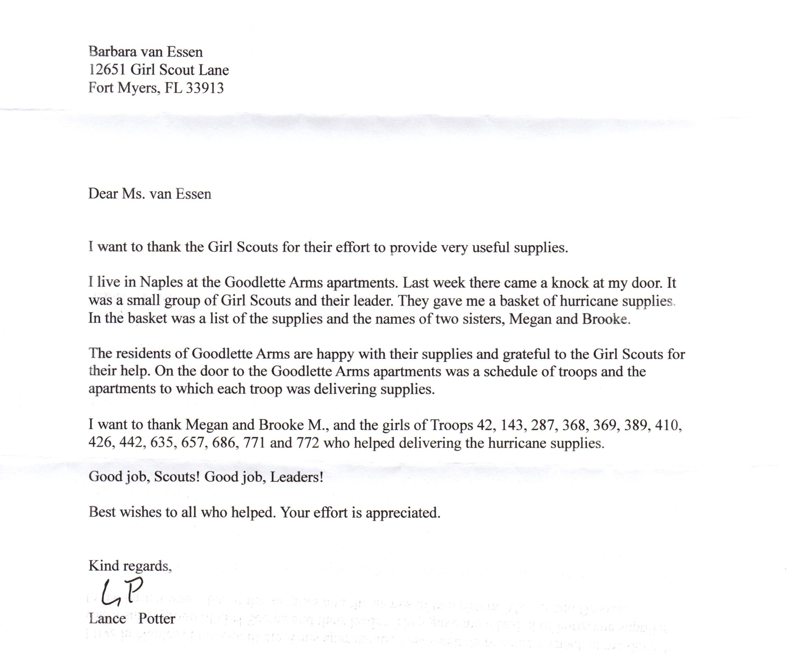 Below is a thank you letter from one of the residents.