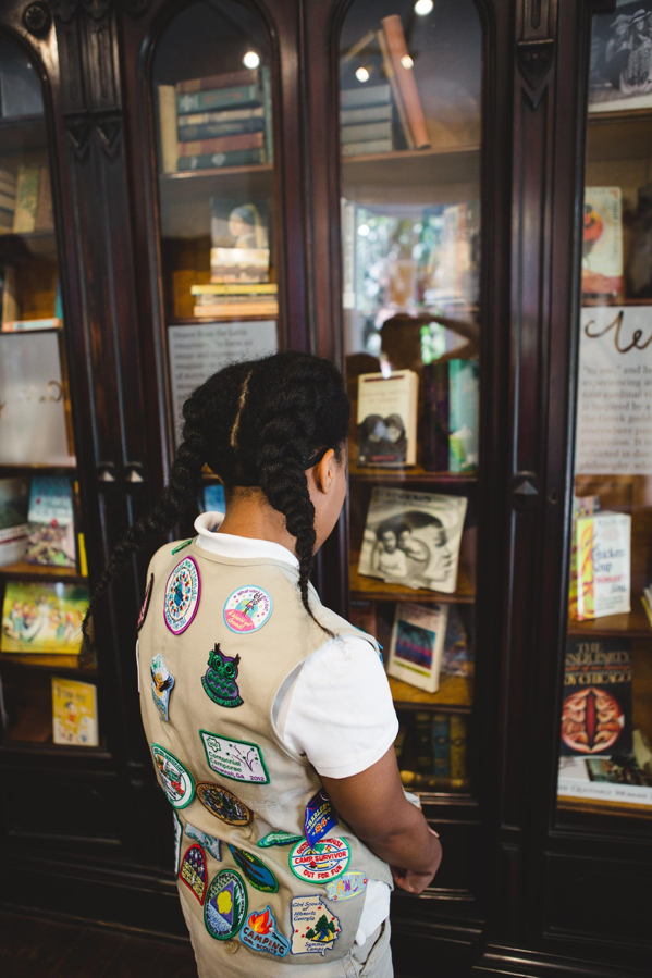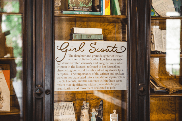 What were these big changes in a small package? The library was transformed from the traditional historic house museum presentation (static and singular-sensory), with little connection to Girl Scouts or even Juliette Gordon Low, to an interactive and layered space. Visitors are encouraged to touch, listen, and see the importance of the written and spoken word as necessary tools to building girls of courage, confidence, and character. The exhibit includes different languages and learning styles, as well as a seamless intersection of art and history, resulting in a bright, creative, and thought-provoking space. Some of the first Girl Scout badges are displayed, highlighting the importance of learning different languages. iPads feature video content of a poetry recited at the White House by Rita Dove, the former Poet Laureate of the United States (and a Girl Scout!). The room’s historic furnishings are filled with a revolving collection of books by, for, and about girls and to underscore the multiple roles and contributions they’ve made at Girl Scouts and throughout history. Whether visitors are leaving their own lines of poetry under the “PoeTree,” inspired by a 1920s Girl Scout silhouette graphic; playing Scrabble in Spanish; or reading Juliette Gordon Low’s musings from her journal, there are plenty of opportunities for them to find their own voices and connect. All within the cozy heart of a library!