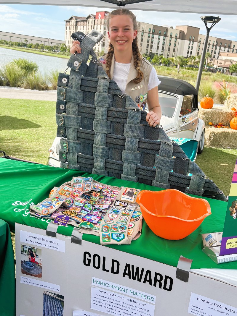 She brought her Gold Award to the public, setting up tables at the Paradise Sports Complex Fall Festival and the Collier County Museum Family Day. Visitors were able to see the enrichment devices in action and learn about animal welfare.