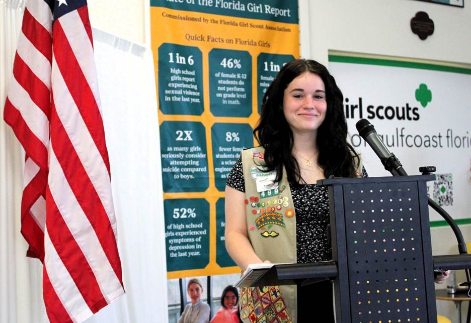 When we unveiled The State of the Florida Girl report, Mackenzie stepped up to the podium inspired to raise her voice once again—this time not on an international stage, but in her own community. Before a crowd of leaders, politicians, reporters, and nonprofit directors, she spoke about her journey in Girl Scouts.